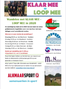 Vanaf 11 januari 2017 wordt er iedere week gewandeld vanaf De Rietschoot in Koedijk om 9.30 uur door Jolanda Huiting van Klaar mee Loop mee.